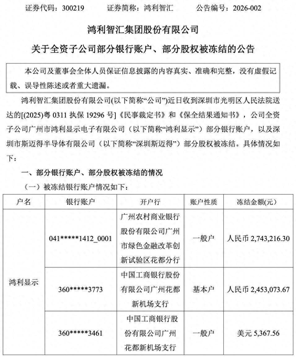 1月9日启恒配资,鸿利智汇(300219)发布公告,公司近日收到深圳市光明区人民法院送达的《民事裁定书》和《保全结果通知书》,公司全资子公司广州市鸿利显示电子有限公司(以下简称“鸿利显示”)部分银行账户,以及深圳市斯迈得半导体有限公司(以下简称“深圳斯迈得”)部分股权被冻结。