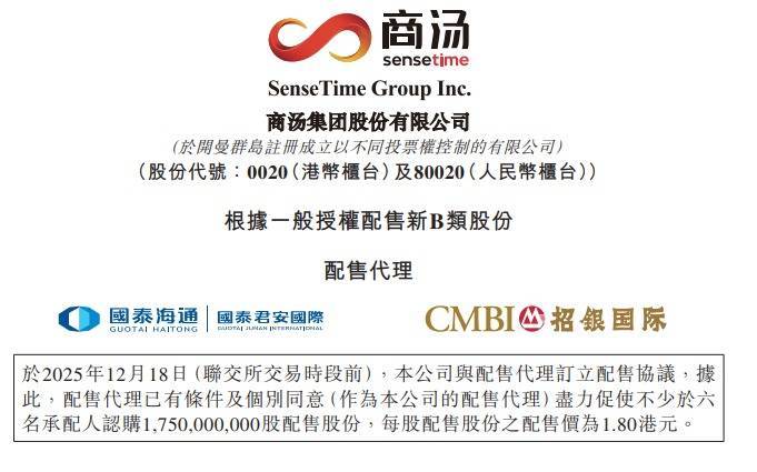 【大河财立方消息】12月18日早间,商汤在港交所公告,与配售代理订立配售协议。据此,配售代理已有条件及个别同意尽力促使不少于六名承配人认购17.5亿股配售股份天盈配,配售价为1.80港元/股。配售价较12月17日收盘价折让约8.63%。